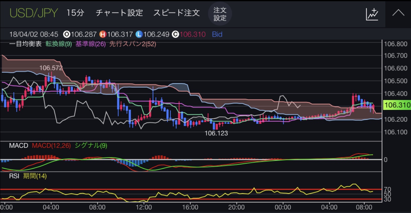 かといって、¥107をどんどん越えるようなイメージも沸かないので スキャル気味にロングして止まったら止め、下がったら押し目買いで ¥106.8くらいまで来ちゃったらショート目線に変えます。